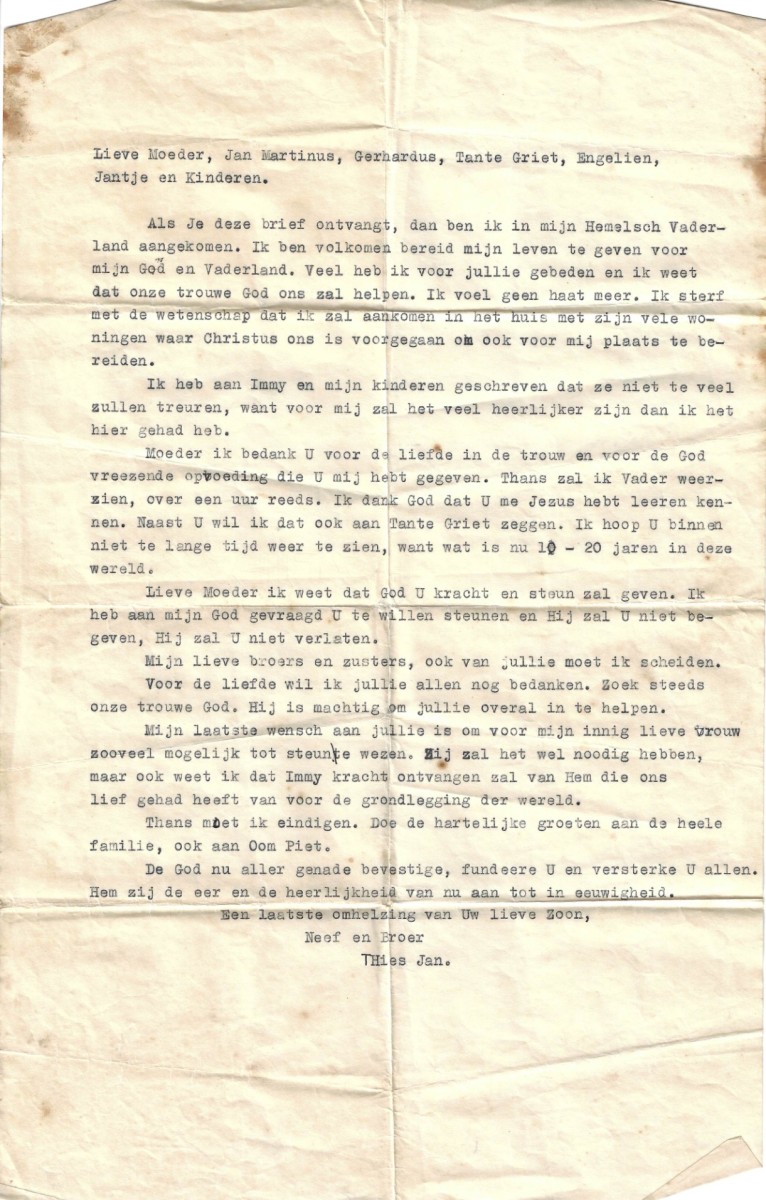 Afscheidsbrief van Thies Jan Jansen aan zijn moeder, broers en zussen, 11 mei 1944
