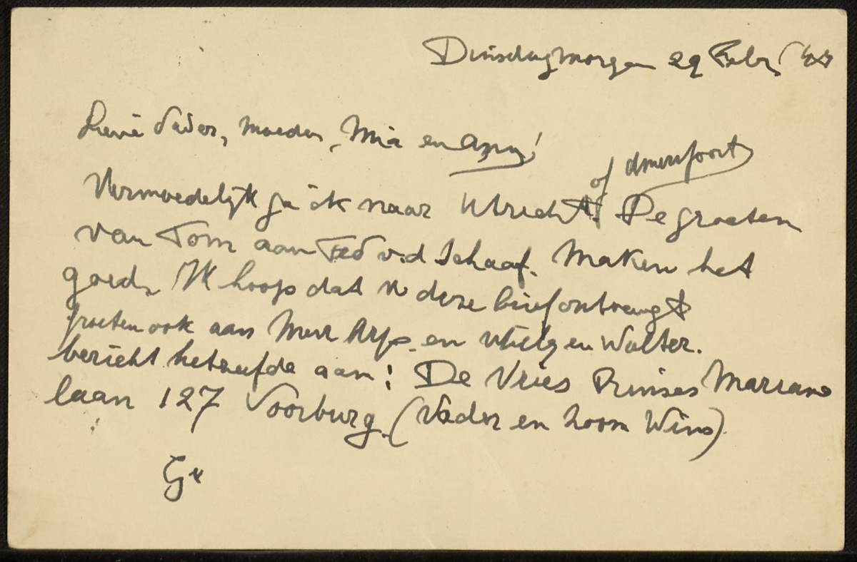 De kaart is geschreven op dinsdagmorgen 29 februari 1944, waarschijnlijk in het Oranjehotel. Jan meldt dat hij naar Utrecht of Amersfoort gaat.